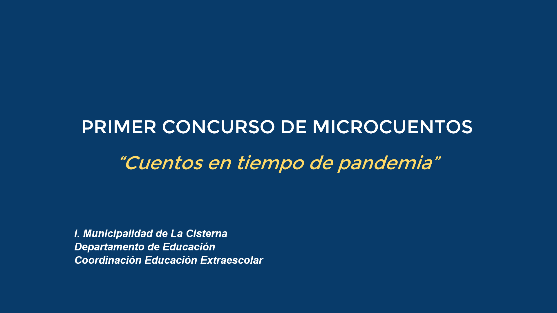 La I. Municipalidad de La Cisterna junto al Departamento de Educación Municipal y Coordinación de Educación Extraescolar han lanzado un nuevo concurso que tiene como objetivo fomentar en los estudiantes de enseñanza básica y media el interés por la producción de textos literarios narrativos, para desarrollar su imaginación y creatividad, considerando la contingencia mundial relacionada con la salud.